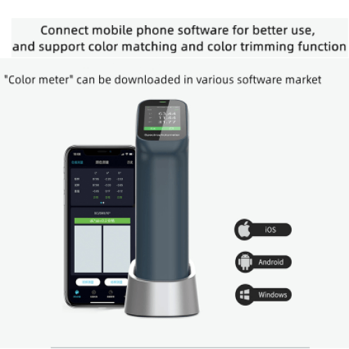 - Máy đo màu cầm tay CS-422 kết nối với ứng dụng di động để tạo cơ sở dữ liệu màu và nhập thông tin thẻ màu để in, sơn, dệt may, v.v.