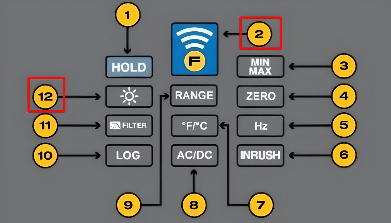 Ý nghĩa ký hiệu của các phím chức năng trên ampe kìm lần lược là: