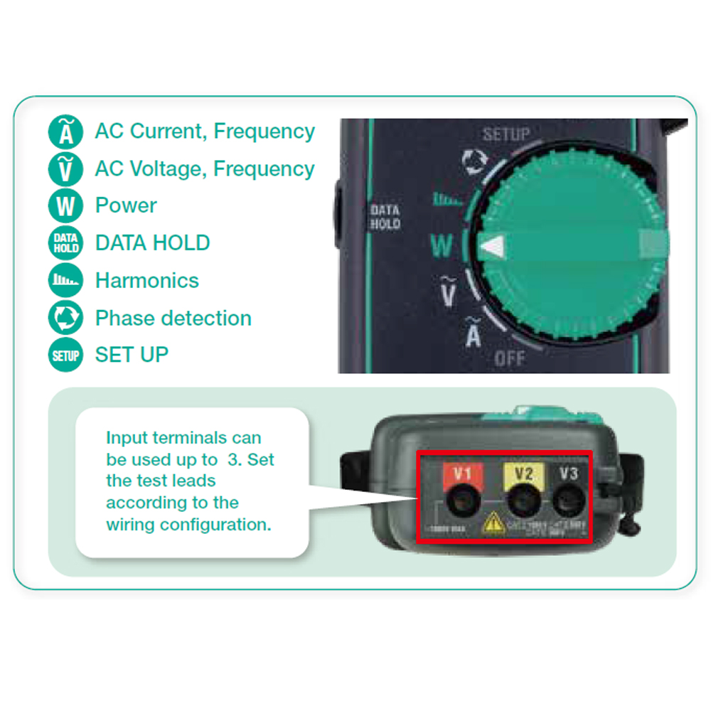 Ampe kìm Kyoritsu 2062BT có thể đo công suất trên bất kỳ hệ thống dây điện nào, thực hiện các phép đo một pha 2 dây/ một pha 3 dây, đo cân bằng và không cân bằng của ba pha 3 dây/ ba pha 4 dây. Trong quá trình đo, màn hình kép có thể hiển thị đồng thời nhiều thông số như W & PF, W & deg, W & VA, W & Var, V & A,…