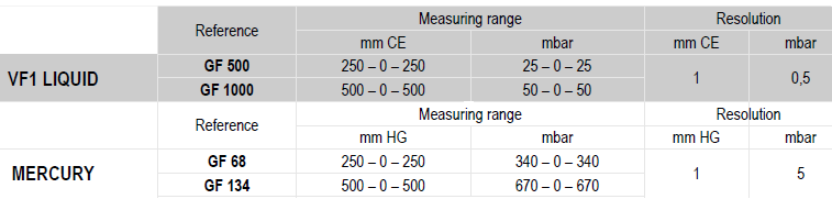 - Chất lỏng đo áp suất: VF1 có mật độ 13,545 hoặc thủy ngân có mật độ 1
