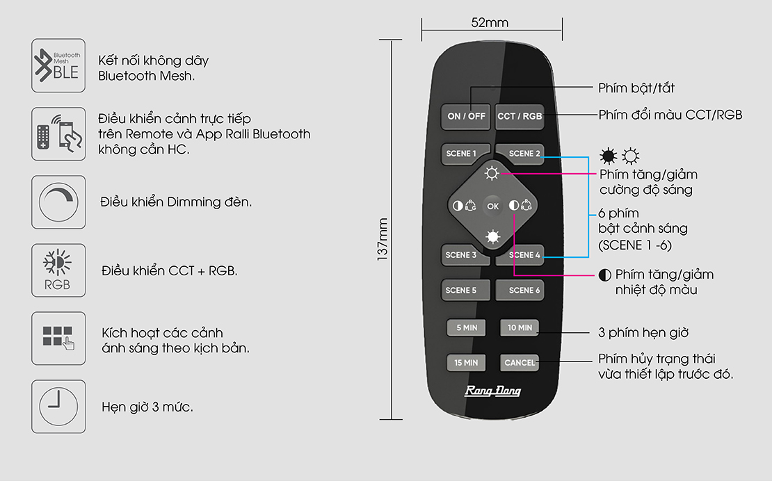Điều khiển cảnh cầm tay RD-SC.M4 với tính năng điều chỉnh cường độ sáng 10-100% và thay đổi màu ánh sáng 3000K – 6500K, màu ánh sáng RGB mang đến cho bạn nhiều lựa chọn về ánh sáng phù hợp tâm trạng, tốt cho sức khoẻ.