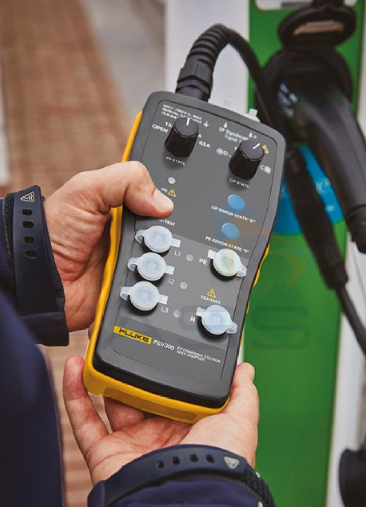 Bộ chuyển đổi này mô phỏng một chiếc xe điện và mở chu kỳ sạc, kích hoạt đầu ra điện áp và dòng điện, cho phép thực hiện kiểm tra kết hợp với các thiết bị kiểm tra phù hợp như máy kiểm tra lắp đặt (Fluke 1664 FC) và/hoặc ScopeMeter® (Fluke 120B Series). Với bộ dụng cụ chuyển đổi, có thể kiểm tra các trạm sạc theo tiêu chuẩn IEC/EN 61851-1 và IEC/HD 60364-7-722.