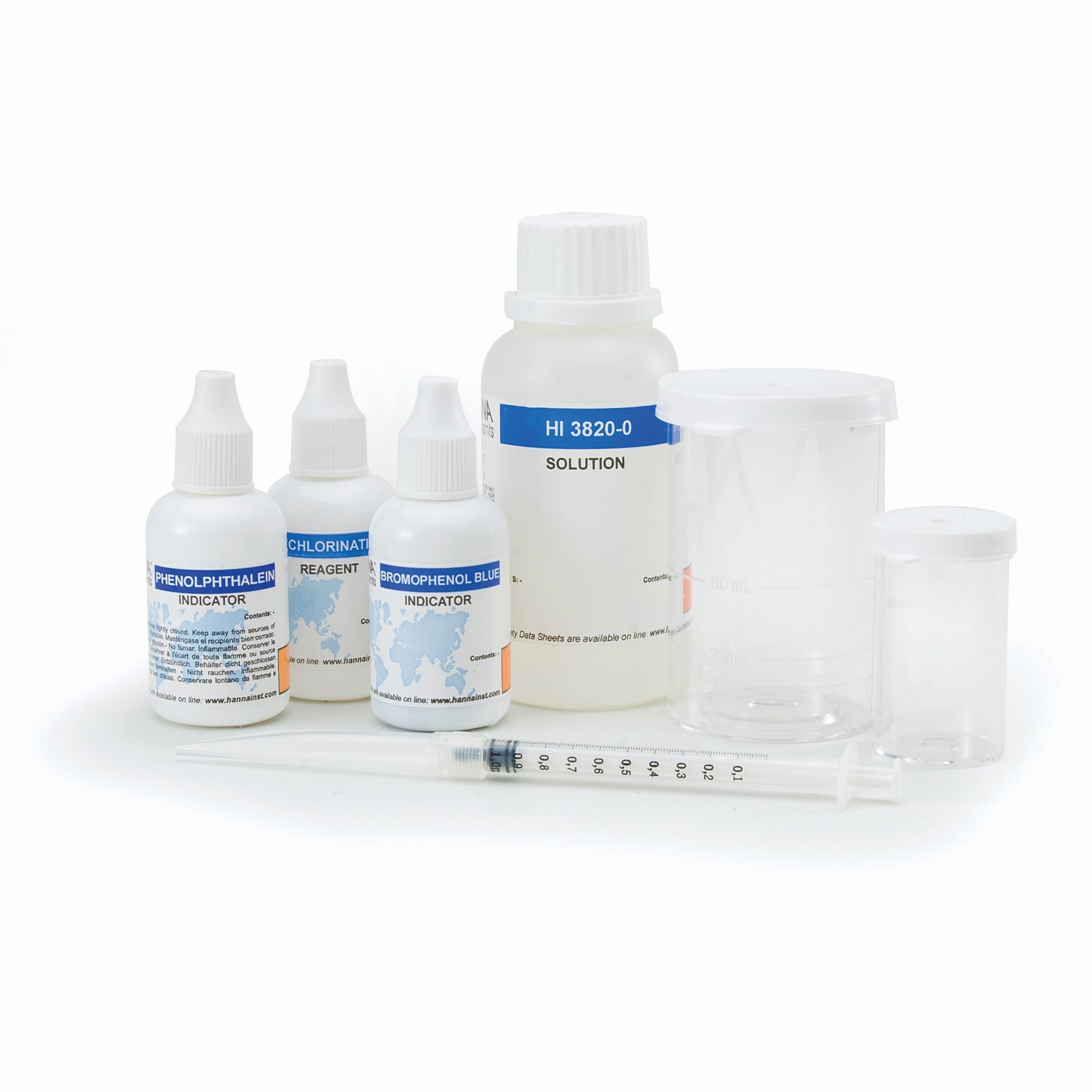 Cung cấp gồm | Bộ dụng cụ HI3820 cung cấp kèm: – 1 chai nhỏ giọt chất khử clo (10 mL) – 1 chai nhỏ giọt chất chỉ thị bromophenol xanh (10mL) – 1 chai nhỏ giọt chất chỉ thị phenolphthalein (10 mL) – 1 chai chất chuẩn độ axit HI3820-0 (120 mL) – Cốc nhựa 10 mL và 50 mL – Ống tiêm – Hướng dẫn sử dụng |