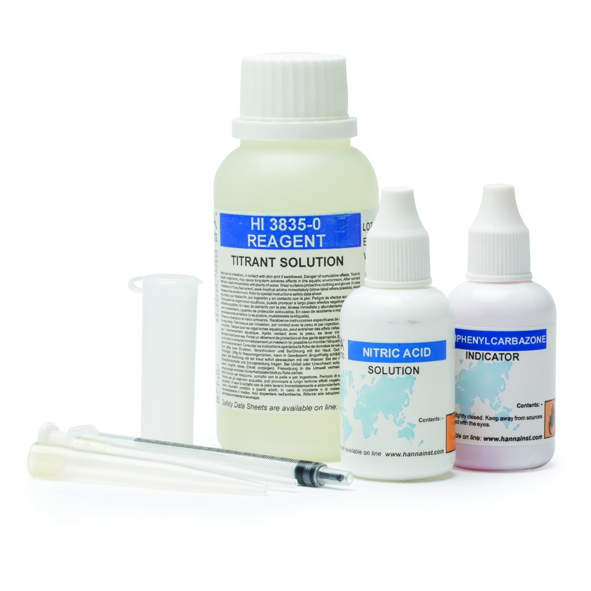 HI3835 cung cấp kèm thuốc thử cho 100 lần đo và đầy đủ phụ kiện như cốc, xilanh