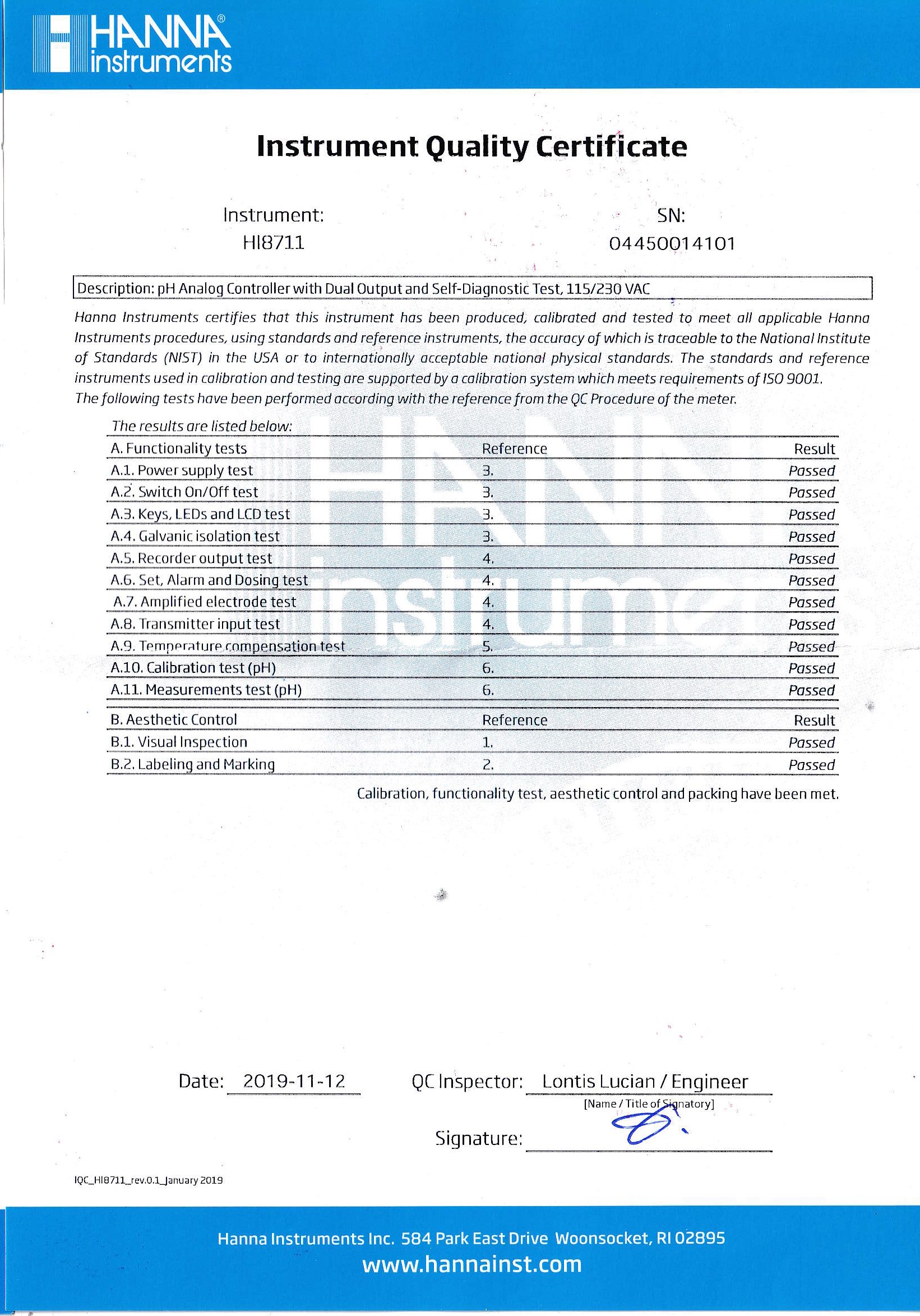 Thông số kỹ thuật Hanna HI8711