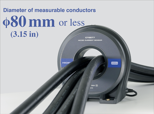 Nhờ vào khẩu độ rộng 80 mm, CT6877A có khả năng chứa đựng tới bốn dây với đường kính ngoại vi lên tới 31 mm, tương ứng với tiết diện 250 mm^2. Với cấu trúc này, chỉ một cảm biến là đủ để đo lường tổng dòng điện của các dây lên đến 2000 A.