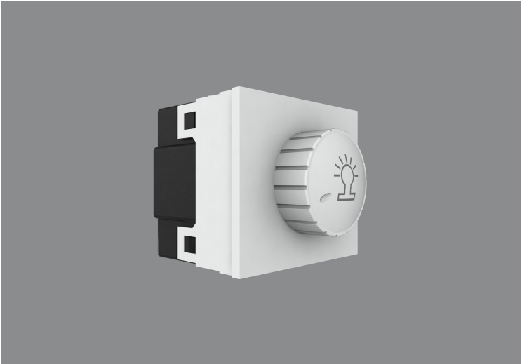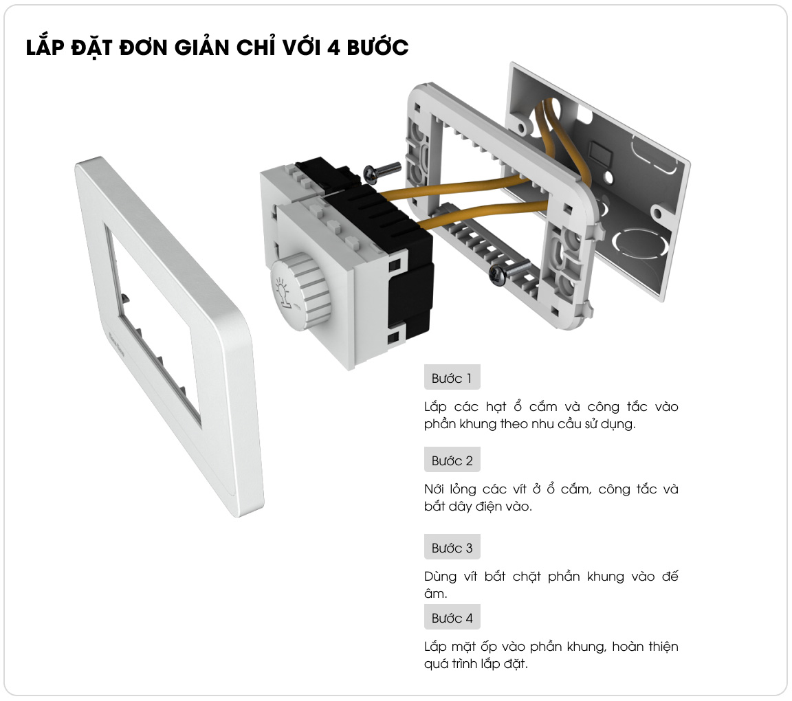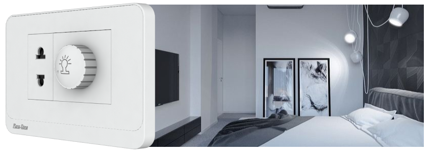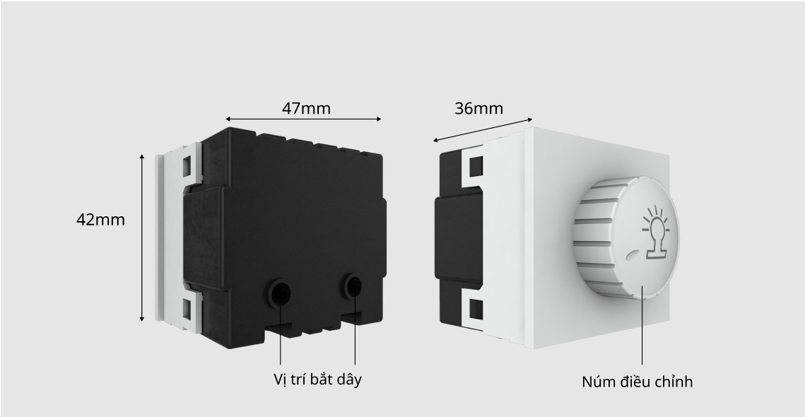Hạt chiết áp điều khiển đèn có thể linh hoạt lắp vào mặt ba cùng các hạt công tắc và ổ cắm, phù hợp với mục đích sử dụng của từng gia chủ và từng khu vực trong nhà.