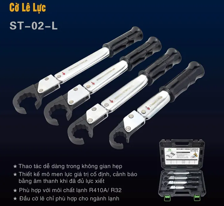 - Tương thích R410A/R32: Các gas lạnh áp suất cao như R410A và R32 đòi hỏi lực siết chặt hơn và cực kỳ chính xác để đảm bảo kín khít, bộ ST-02-L được thiết kế với các mức lực cố định (Fixed Torque) phù hợp tiêu chuẩn của các nhà sản xuất máy lạnh.