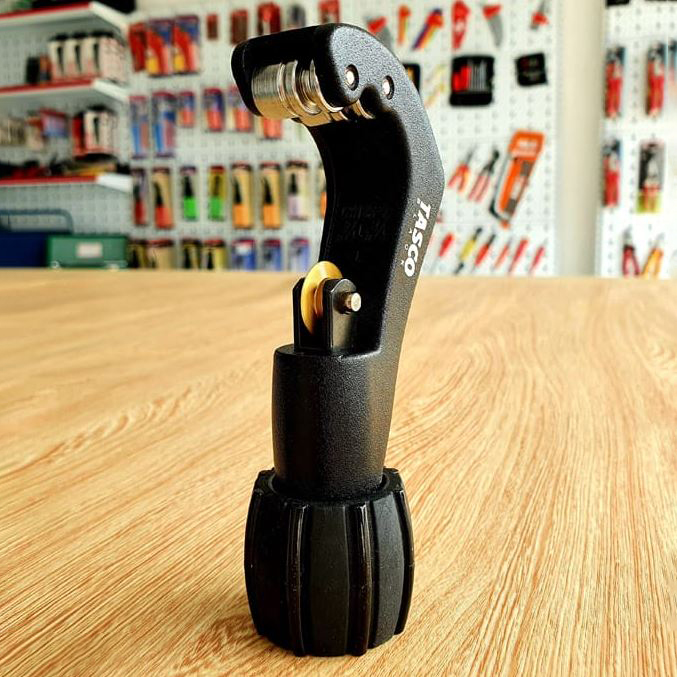 - Cơ Chế Vận Hành Mượt Mà: Núm vặn được thiết kế công thái học, giúp người dùng dễ dàng điều chỉnh lưỡi dao tiến vào và cắt ống chỉ với lực vặn nhẹ nhàng. Các con lăn dẫn hướng (roller) giúp ống xoay tròn đều, đảm bảo vết cắt vuông góc và chính xác.