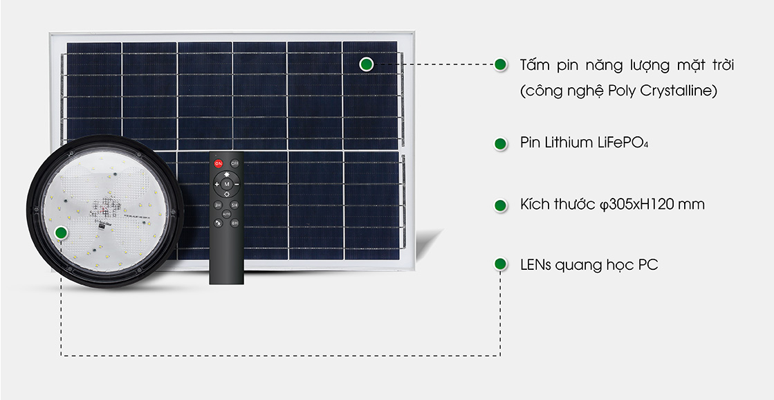 - Bộ điều khiển nạp/ xả thông minh có chức năng bảo vệ Pin và dimming cho phép đèn hoạt động trong thời gian dài và chiếu sáng linh hoạt.