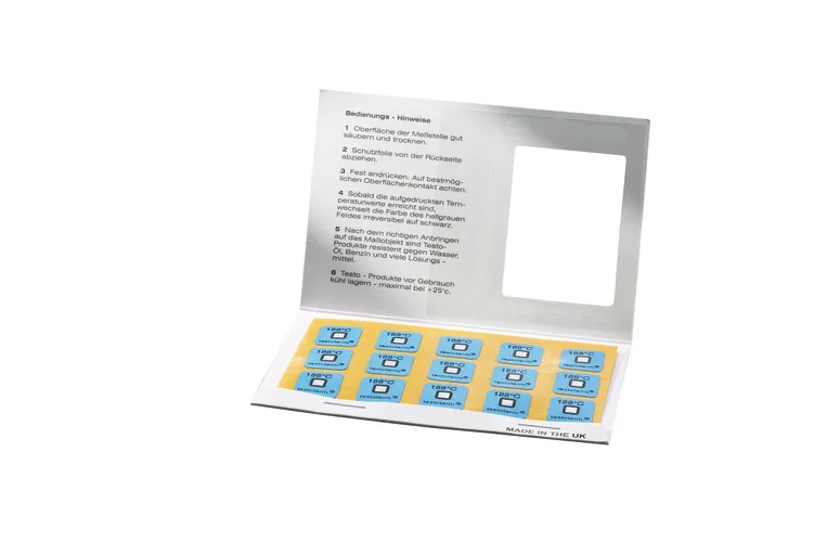 Testo 0646 1065 là phim nhạy nhiệt tự dính, phản ứng bằng cách thay đổi màu sắc khi nhiệt độ nhất định bị vượt quá. Chúng rất lý tưởng cho việc theo dõi nhiệt độ của sản phẩm và quy trình nơi mà một nhiệt độ cụ thể không được phép vượt quá.