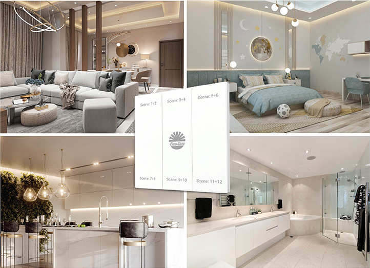 Với số lượng 12 kịch bản ánh sáng, điều khiển cảnh RD-SC.M3 có thể kết hợp với các thiết bị BLE khác để thiết lập nhiều kịch bản khác nhau như Về nhà, Thức dậy, Ăn tối, Dạ tiệc… thông qua bộ điều khiển trung tâm HC.