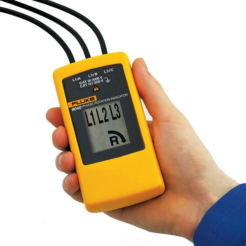 Thiết bị đo chỉ thị pha Fluke 9040 hoạt động như một chỉ báo trường quay, cung cấp thông tin rõ ràng về ba pha qua màn hình LCD và hướng xoay pha, giúp xác định đúng các kết nối cần thiết.