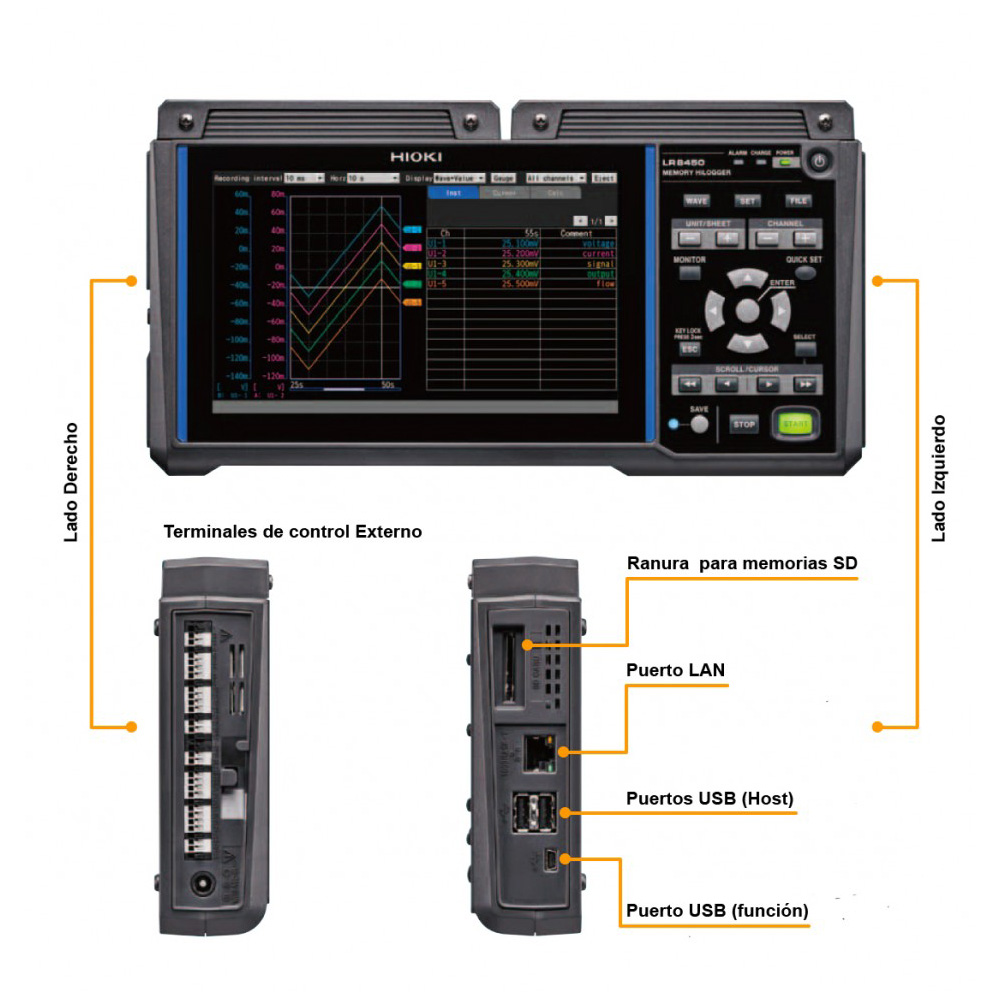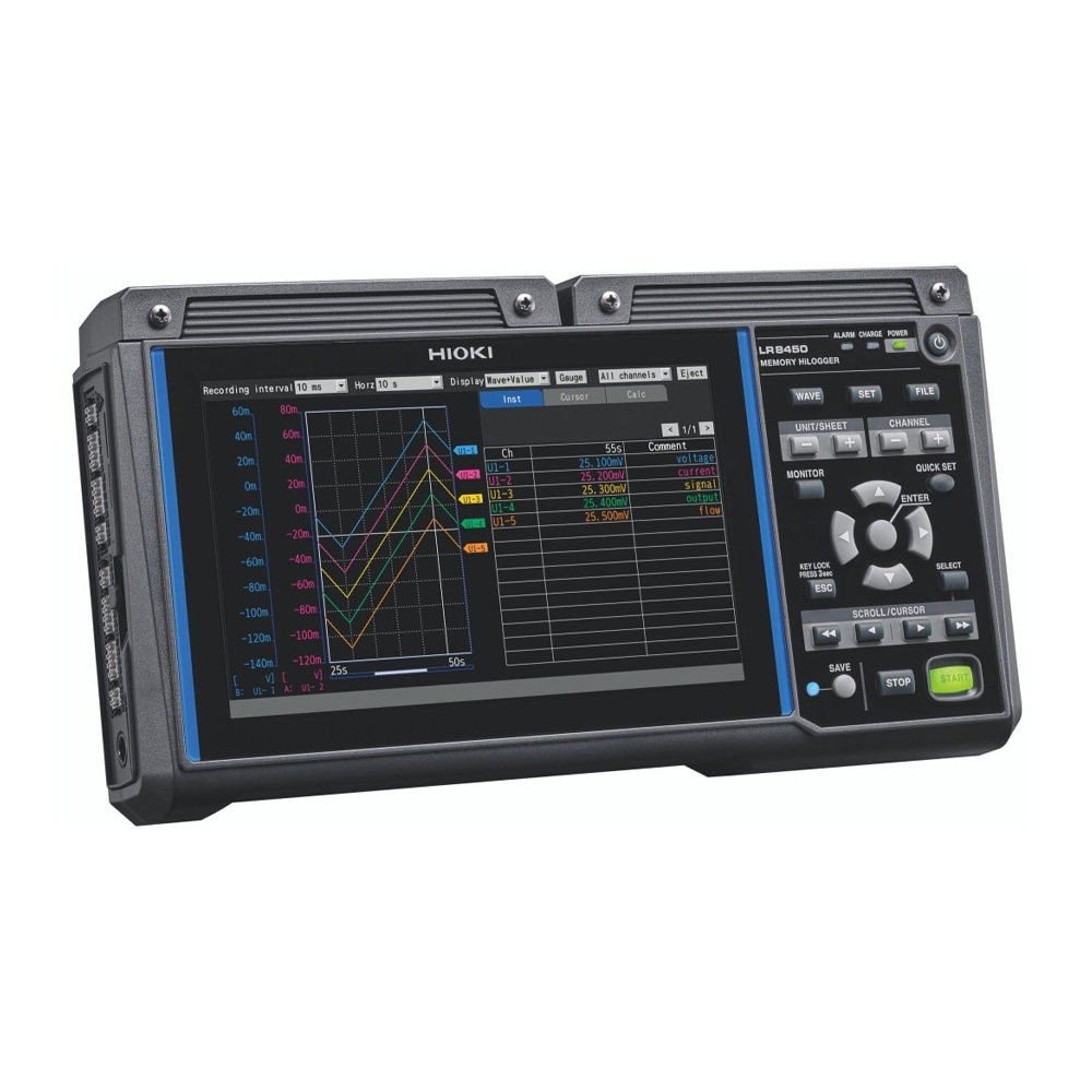 | Functions hioki LR8450 | Save waveform data in real time to the SD memory card or USB drive, numerical value calculations, waveform calculations, 8ch alarm output, voltage output ×2 (5 V /12 V /24 V selectable) | |||||