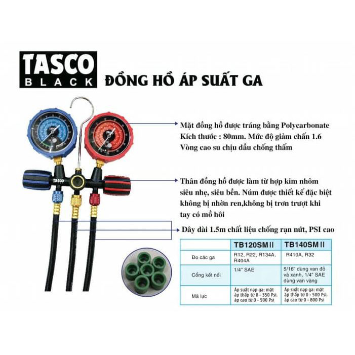 Đồng hồ gas áp suất đôi Tasco TB140SM II, Dùng để đo áp suất gas R32, R410A trong ngành lạnh, xuất xứ Đài Loan, bảo hành chính hãng 12 tháng