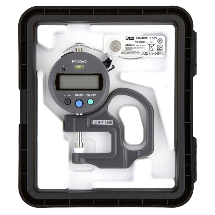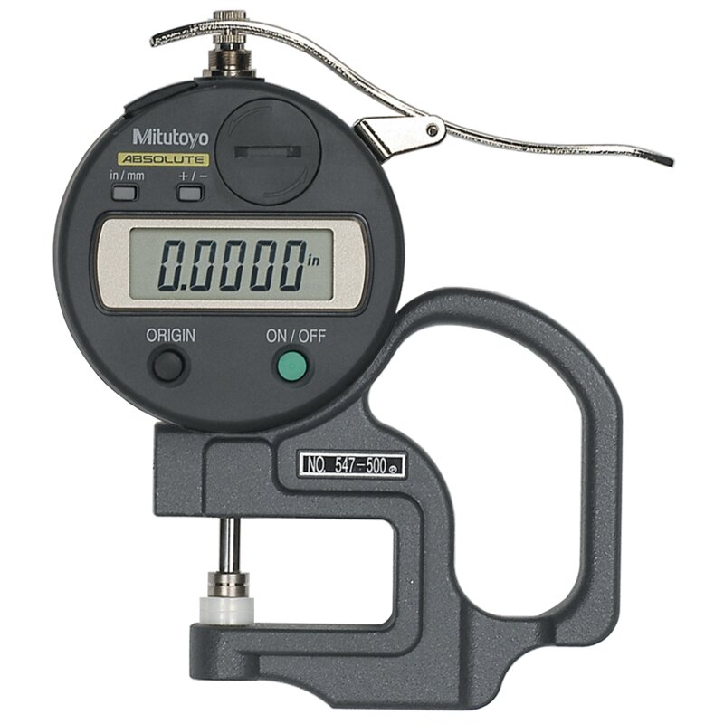 Đồng hồ đo độ dày ABSOLUTE Digimatic với bước đo kỹ thuật số 1 µm là giải pháp chuyên nghiệp để đo độ dày của phim, giấy, và các vật liệu khác với điểm tiếp xúc phẳng.
