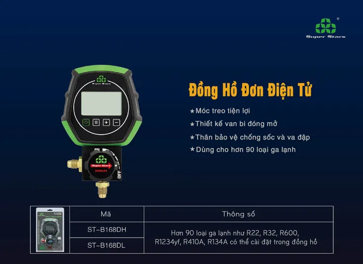 Đồng hồ đơn điện tử áp thấp SUPER STARS ST-B168DL là thiết bị chuyên dụng cho kỹ thuật viên sửa chữa hệ thống lạnh, giúp đo áp suất chính xác, nhanh chóng, dễ sử dụng. Với thiết kế chống sốc, móc treo tiện lợi, hỗ trợ hơn 90 loại gas lạnh, đây là thiết bị không thể thiếu cho các chuyên gia HVAC.