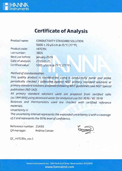 – H7039L là một dung dịch hiệu chuẩn độ dẫn 5000 µS/cm chất lượng cao được chuẩn hóa cùng với một máy đo độ dẫn điện đã được hiệu chuẩn với kali clorua NIST SRM 2202 (Chất liệu tham chiếu tiêu chuẩn) trong nước khử ion dùng trong phân tích theo tiêu chuẩn ISO 3696 / BS3978.