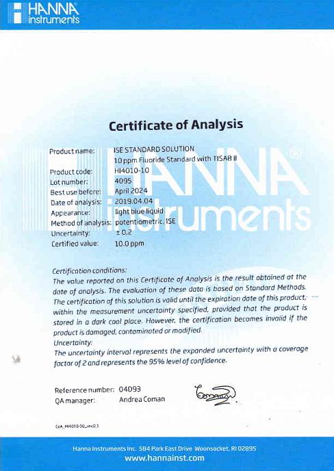 HI4010-10 là dung dịch chuẩn fluoride 10 ppm (mg/L) được trộn sẵn với TISAB II. TISAB II là một dung dịch ISA được dùng để xác định hoạt động của các ion florua trong dung dịch để có thể đo nồng độ của flo. TISAB II cũng làm giảm nhiễu do độ pH thấp và từ các ion tạo phức với fluoride dẫn đến không thể đo được bằng ISE.