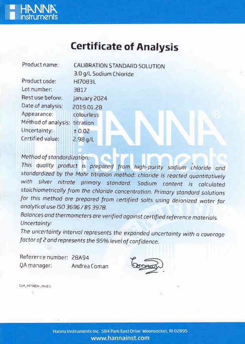 Tổng quan sản phẩm Dung Dịch Hiệu Chuẩn NaCl 3.0 g/L, 500 mL Hanna HI7083L