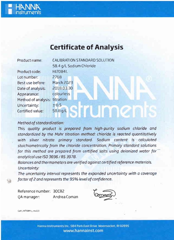 Tổng quan sản phẩm Dung Dịch Hiệu Chuẩn NaCl 58.4 g/L,Chai 500 mL Hanna HI7084L