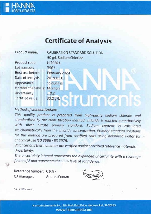 HI7081L là dung dịch tiêu chuẩn NaCl 30 g/L chất lượng cao được sản xuất theo tiêu chuẩn ISO 3696 / BS3978 sử dụng muối có độ tinh khiết cao, nước khử ion, cân bằng kiểm tra trọng lượng và thủy tinh loại A trong môi trường được kiểm soát nhiệt độ được theo dõi bằng nhiệt kế được chứng nhận. Các giá trị được báo cáo có thể truy nguyên theo Tài liệu tham khảo tiêu chuẩn (SRM) của NIST.