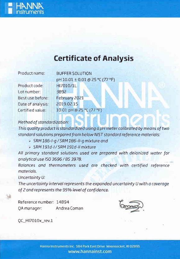 Tổng quan sản phẩm Dung Dịch Hiệu Chuẩn pH 10.01, Chai 1 Lít Hanna HI7010/1L