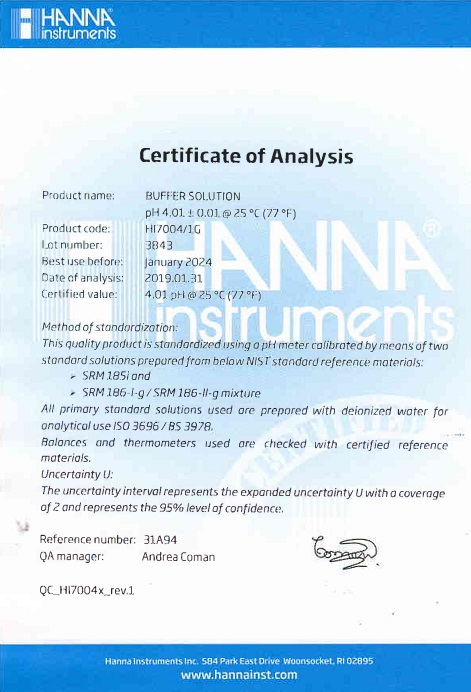 HI7004/1G là một dung dich hiệu chuẩn pH 4.01 chất lượng cao NIST và được cung cấp kèm Chứng nhận Phân Tích (COA). Dung dịch hiệu chuẩn Hanna có số lô sản xuất và ngày hết hạn ghi rõ trên nhãn và nắp có vòng bảo vệ để đảm bảo chất lượng.