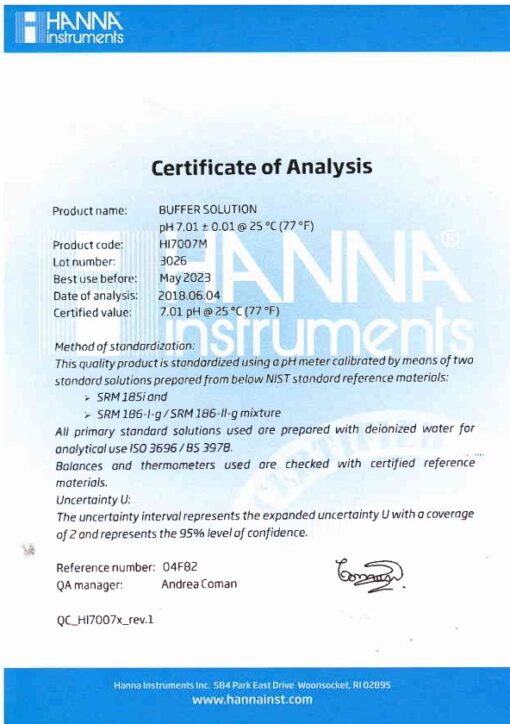 HI7007M là một dung dich hiệu chuẩn pH 7.01 chất lượng cao NIST và được cung cấp kèm Chứng nhận Phân Tích (COA). Dung dịch hiệu chuẩn Hanna có số lô sản xuất và ngày hết hạn ghi rõ trên nhãn và nắp có vòng bảo vệ để đảm bảo chất lượng.