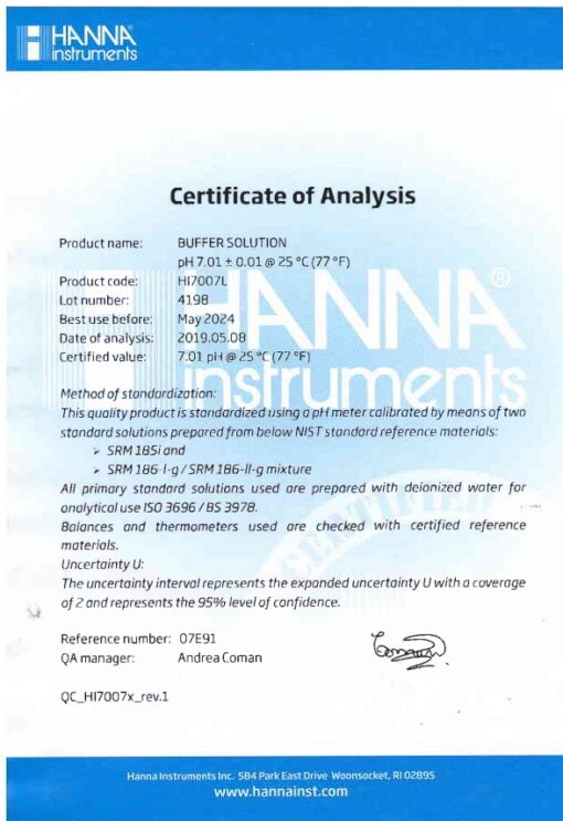 Tổng quan sản phẩm Dung Dịch Hiệu Chuẩn pH 7.01, Chai 500mL Hanna HI7007L