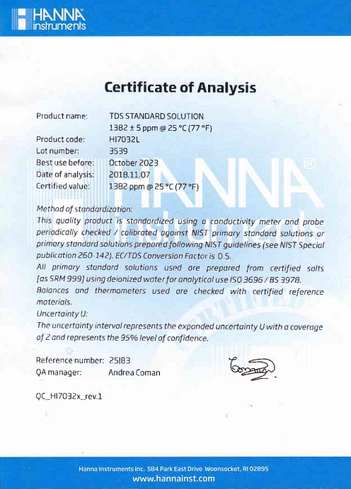 H7032L là một dung dịch hiệu chuẩn 1382 mg/L (ppm) chất lượng cao được chuẩn hóa cùng với một máy đo độ dẫn điện đã được hiệu chuẩn với kali clorua NIST SRM 2202 (Chất liệu tham chiếu tiêu chuẩn) trong nước khử ion dùng trong phân tích theo tiêu chuẩn ISO 3696 / BS3978.