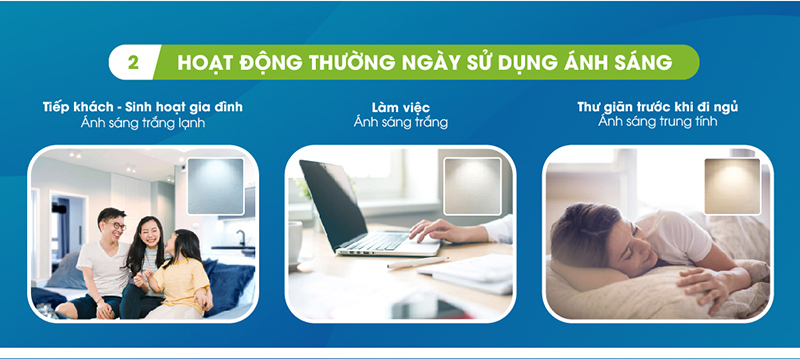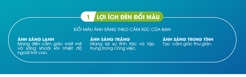 - Đèn có tính năng đổi 3 màu ánh sáng, tăng giá trị sử dụng cho người dùng 1 đèn tương đương 3 đèn. Đổi màu ánh sáng – đổi màu cảm xúc.