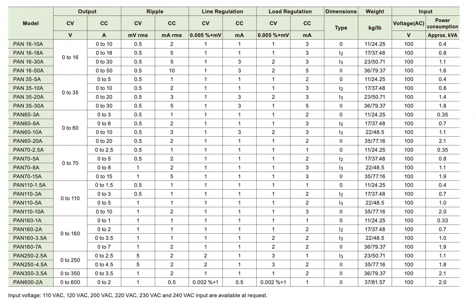 Thông số kỹ thuật của KIKUSUI PAN-A Series