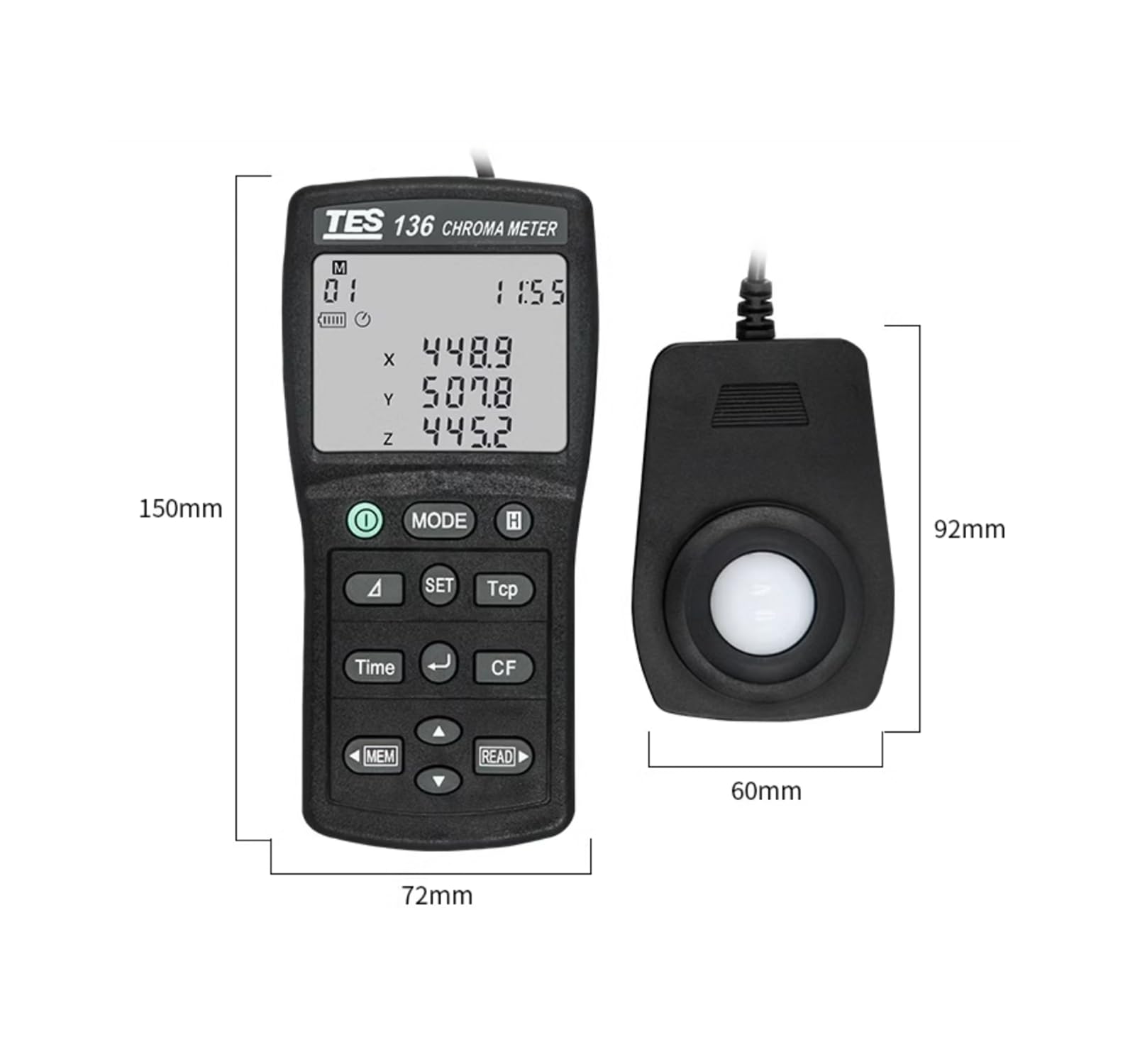 - Đo các giá trị ba màu, sắc độ, độ chênh lệch màu, nhiệt độ màu tương quan và độ rọi của nguồn sáng.