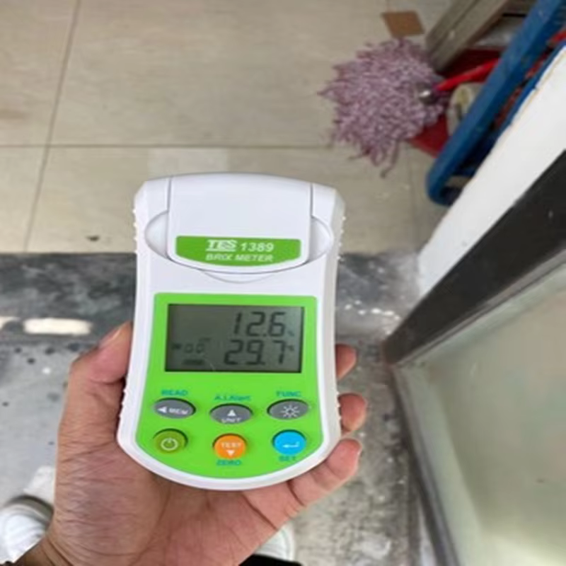 Máy đo độ ngọt TES 1389 là thiết bị đo độ ngọt thực phẩm, được sử dụng để xác định hàm lượng đường trong đồ uống, trái cây và bánh kẹo. Máy có khả năng đo Brix trong khoảng từ 0 đến 53%, đồng thời cung cấp thông tin về chỉ số khúc xạ (RI) và nhiệt độ. Thiết bị còn được trang bị chức năng tự động bù nhiệt độ ATC, giúp nâng cao độ chính xác của phép đo.