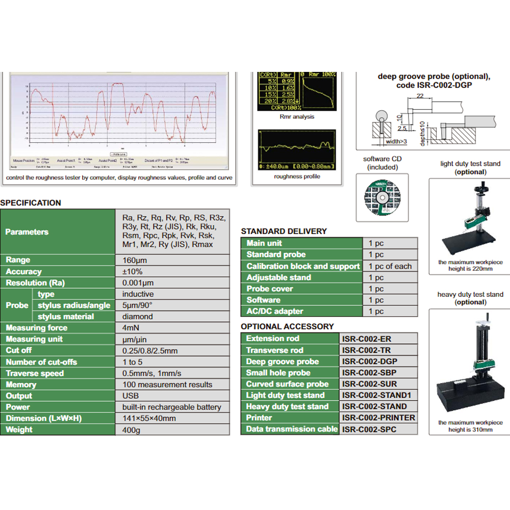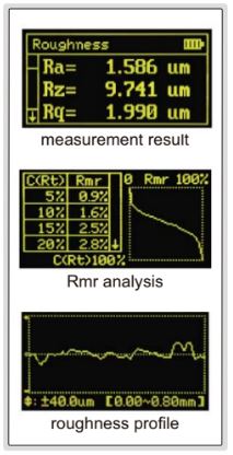 | Thông số độ nhám | Ra, Rz, Rq, Rv, Rp, RS, R3z, R3y, Rt, Rz (JIS), Rk, Rku, Rsm, Rpc, Rpk, Rvk, Rsk, Mr1, Mr2, Ry (WS), Rmax | |
