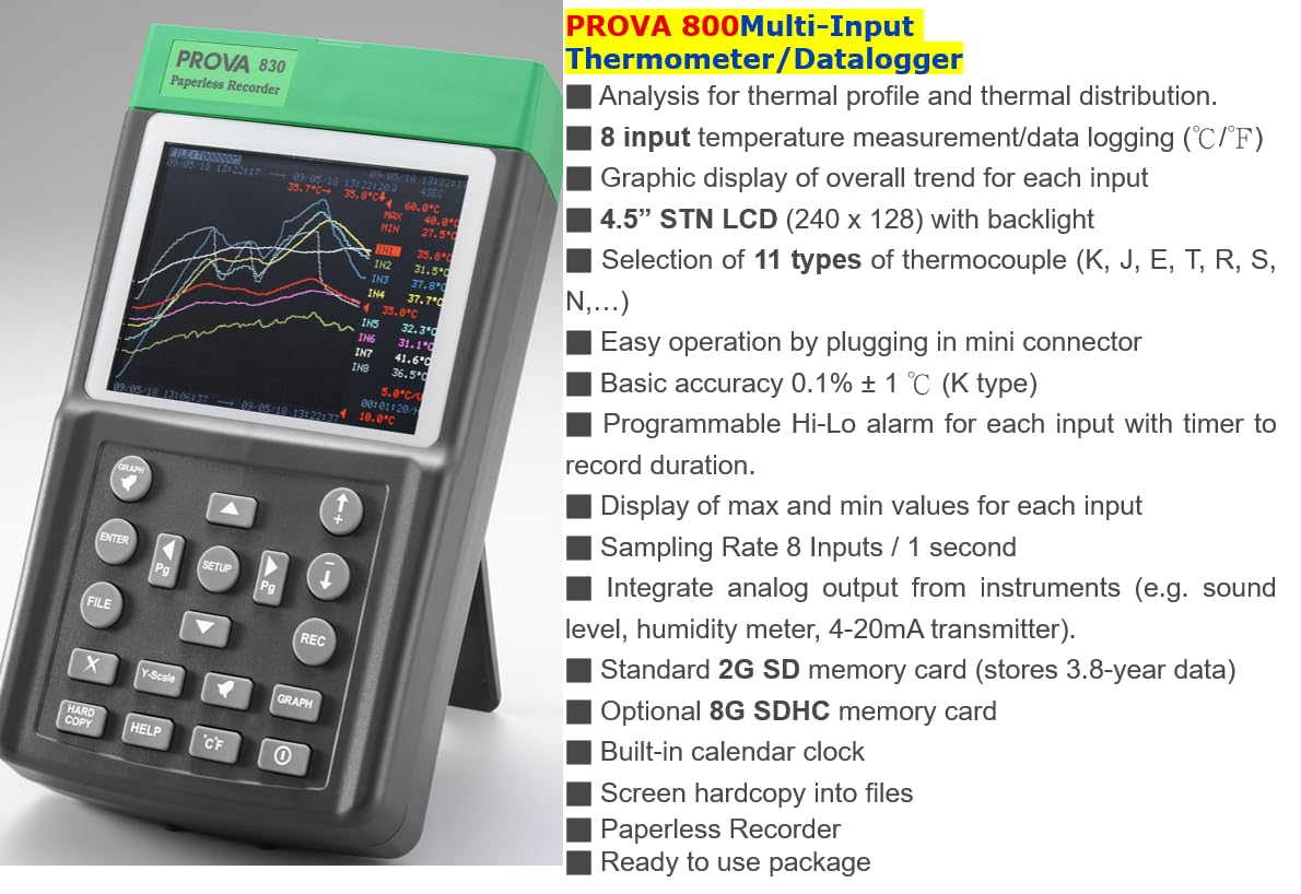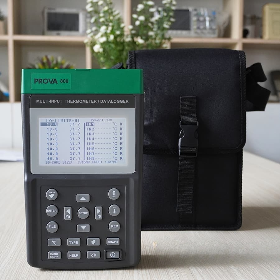 Prova 800 là một thiết bị đo và phân tích nhiệt độ với khả năng hỗ trợ 11 loại cặp nhiệt độ, cùng 8 kênh đầu vào để đo và ghi dữ liệu nhiệt độ. Màn hình đồ họa sắc nét của Prova 800 hiển thị xu hướng nhiệt độ theo từng đầu vào, đồng thời cho phép người dùng cài đặt cảnh báo nhiệt độ cao, thấp và thời gian cảnh báo.