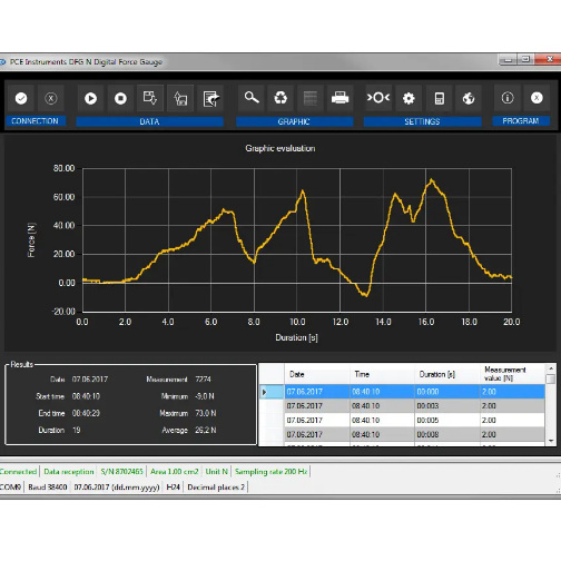 Máy đo lực được trang bị giao diện USB, cho phép đọc dữ liệu đo vào phần mềm PC, tạo các nhật ký đo lường và lưu trữ, xuất dữ liệu. Máy có màn hình LCD đồ họa hiển thị các giá trị đo dưới dạng số và đồ họa. Hơn nữa, thiết bị đo lực được bảo vệ theo chuẩn IP54 nên có thể sử dụng trong môi trường công nghiệp khắc nghiệt, cũng như thực hiện các thử nghiệm kéo và nén ngoài trời trong điều kiện thời tiết xấu.