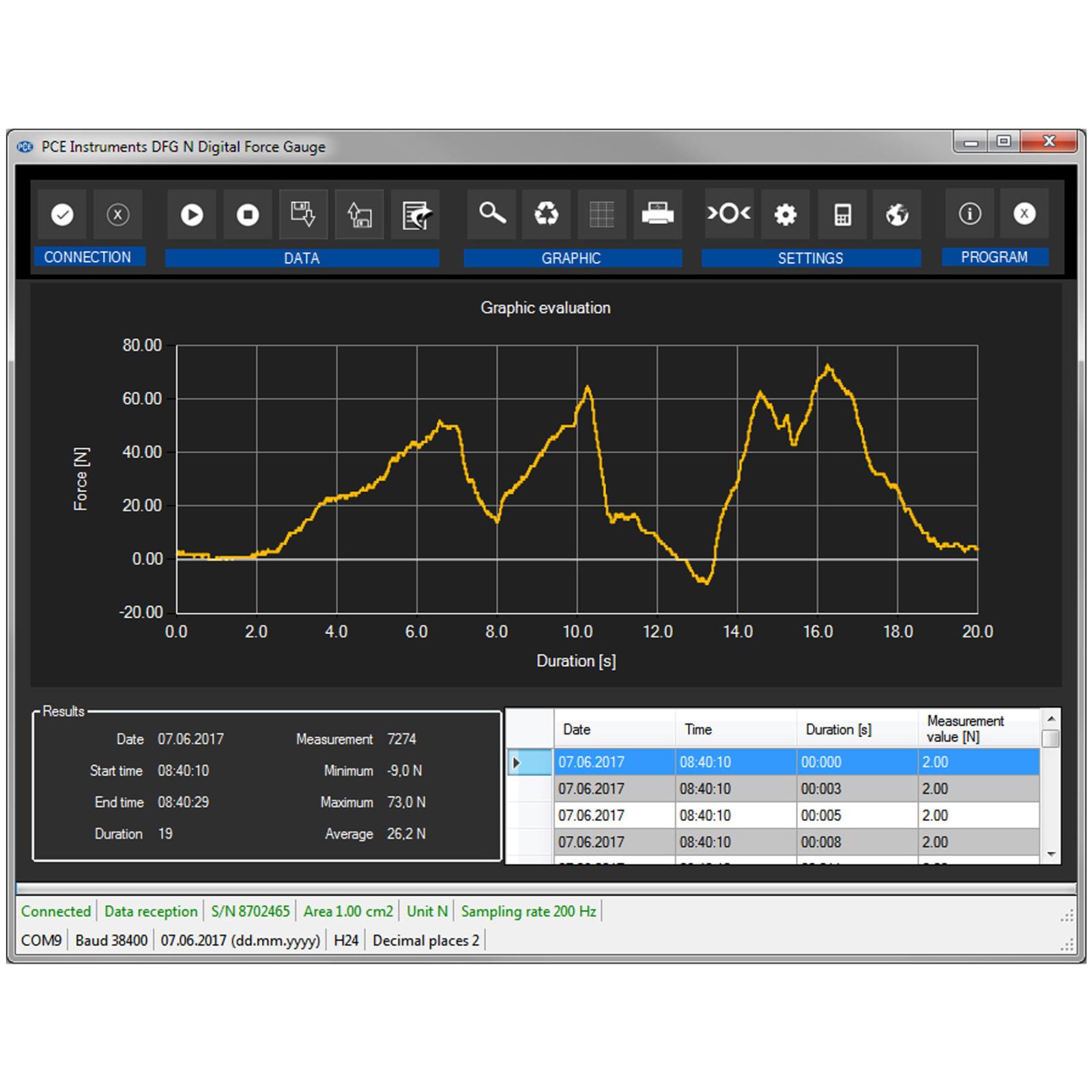 PCE PCE-DFG N 5K có khả năng đo cả lực kéo và lực nén với độ phân giải rất cao. Các lực kéo và nén thường được xác định trong phòng thí nghiệm để đo độ bền, lực kéo đứt, và lực cần thiết để kích hoạt nút bấm hoặc công tắc.