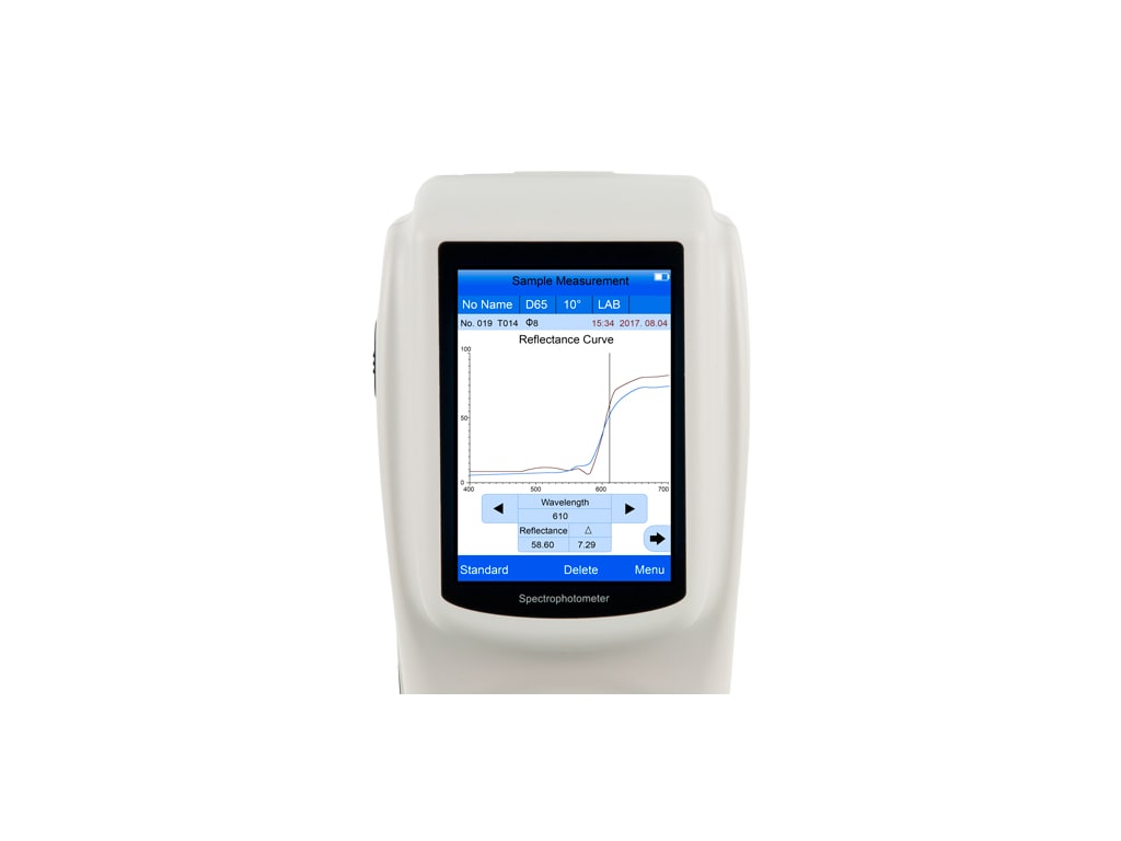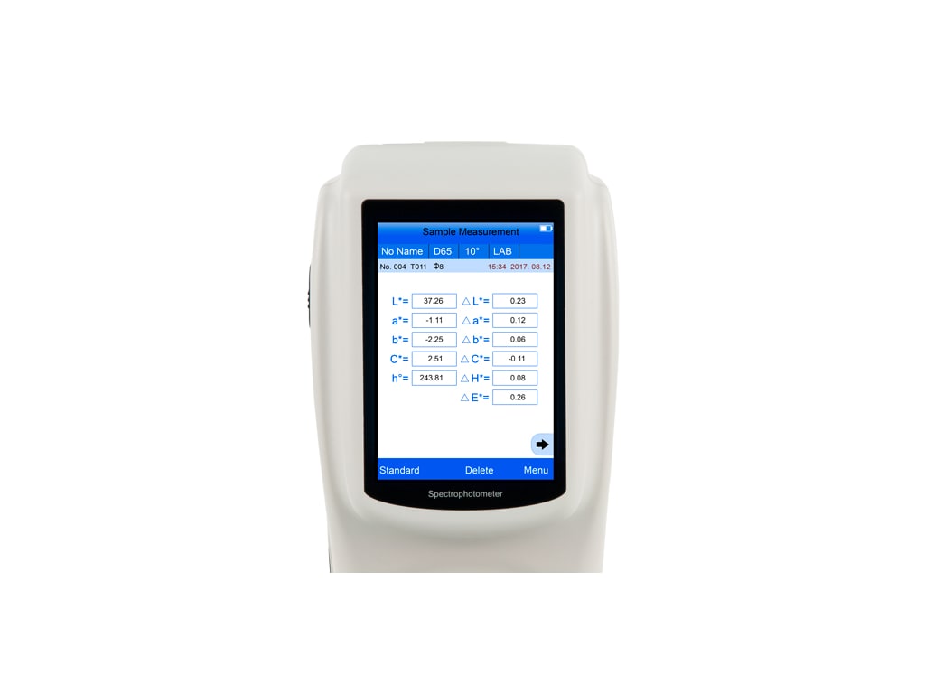 - Chức năng hiển thị: Giá trị quang phổ/biểu đồ, giá trị đo màu, sự khác biệt màu sắc (giá trị/biểu đồ), kết quả ĐẠT/ KHÔNG ĐẠT, độ lệch màu, mô phỏng màu, cài đặt chỉ số màu (ΔE*94, ΔE*cmc, ΔE*2000), cài đặt giới hạn lỗi, cài đặt thời gian, cài đặt ngôn ngữ, khôi phục cài đặt gốc