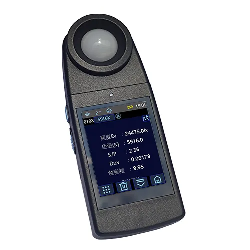 Thiết bị này không chỉ có thể đo phổ bức xạ, Ev, CCT, CRI, cân bằng trắng mà còn đo các thông số về gam màu hiển thị, độ đồng đều, CQS, TM-30, nhấp nháy và các thông số khác.