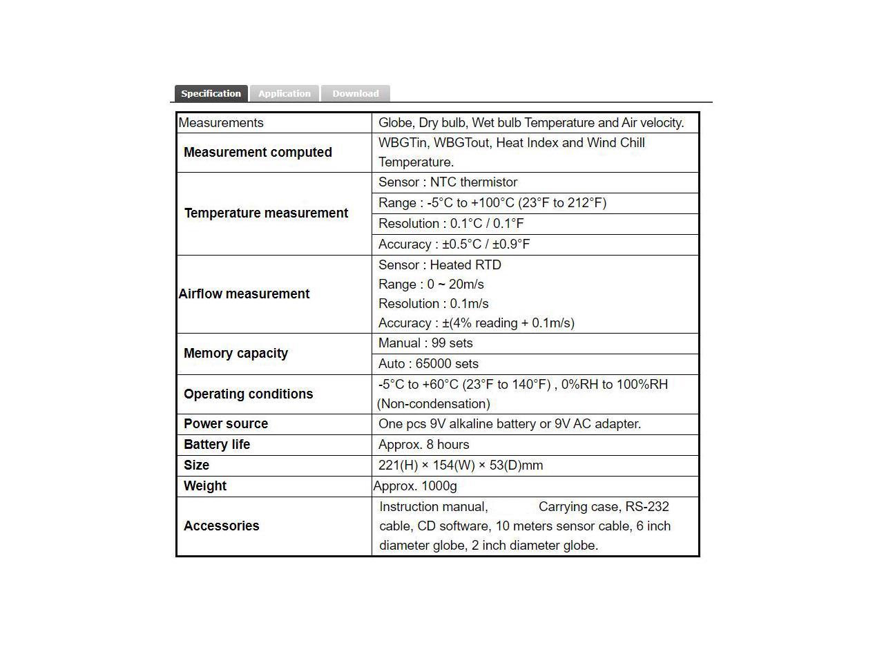 - Máy đo sử dụng phương pháp đo lường WBGT nhanh để đánh giá mức độ căng thẳng nhiệt của môi trường.