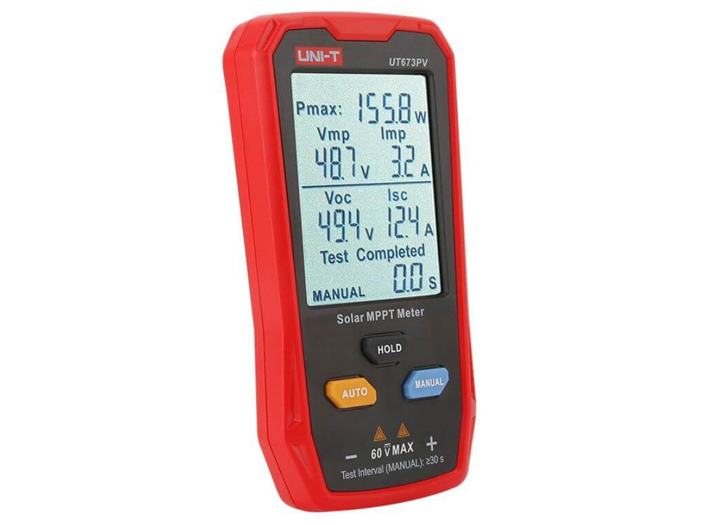 Máy đo năng lượng mặt trời UNI-T UT673PV có thể xác định hiệu quả mọi bất thường trong các tấm pin mặt trời bằng cách kiểm tra công suất tối đa, điện áp nguồn cực đại, dòng điện cực đại, điện áp mạch hở và dòng điện ngắn mạch.