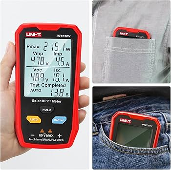 - Đo các thông số quan trọng: UT673PV đo được các thông số như công suất tối đa (Pmax), điện áp mạch hở (Voc), dòng điện ngắn mạch (Isc), điện áp tại công suất tối đa (Vmp) và dòng điện tại công suất tối đa (Imp).