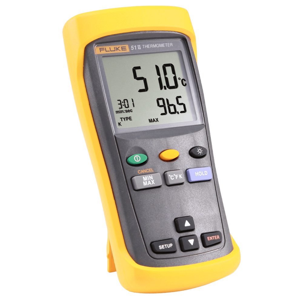 Các nhiệt kế tiếp xúc Fluke 51 Series II mang lại khả năng phản ứng nhanh chóng và độ chính xác cao trong môi trường phòng thí nghiệm (0,05% + 0,3 °C) trong một thiết bị kiểm tra cầm tay bền bỉ. Thiết bị có thể đo nhiệt độ tiếp xúc để kiểm tra động cơ, vật liệu cách nhiệt, bộ ngắt mạch, đường ống, kết nối bị ăn mòn, chất lỏng và dây điện với các cảm biến nhiệt độ chuẩn công nghiệp loại J, K, T, E, N, R, và S.