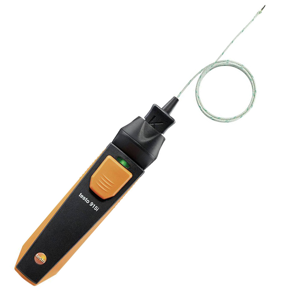 Testo 915i 0563 4915 – Nhiệt kế không dây với đầu dò linh hoạt (TC loại K, cáp phủ sợi thủy tinh, dài 0.8 mét), bao gồm pin và chứng nhận phù hợp.