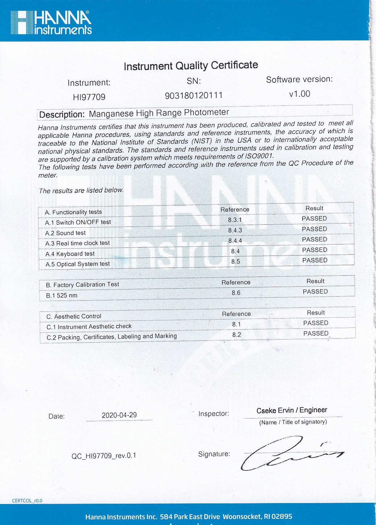 Phụ kiện mua riêng | – HI93709-01: Thuốc thử mangan thang cao, 100 lần đo. – HI93709-03: Thuốc thử mangan thang cao, 300 lần đo. – HI97709-11: Bộ dung dịch CALCheck chuẩn mangan HR cho máy đo. – HI97709C: Combo gồm Máy đo HI97709, 2 cuvet có nắp, kéo, dung dịch hiệu chuẩn máy và vali đựng máy. – HI731318: Khăn lau cuvet, 4 cái. – HI93703-50: Dung dịch rửa cuvet, 230mL. – HI731331: Cuvet thủy tinh, 4 cái. – HI731336N: Nắp đậy cuvet, 4 cái. |