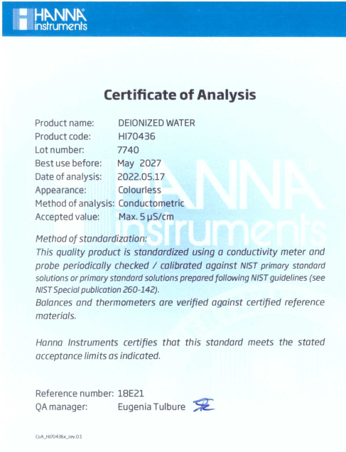 Cách sử dụng | – Dùng để tráng rửa các điện cực hoặc dụng cụ đo. – Dùng để pha loãng mẫu khi cần thiết. |