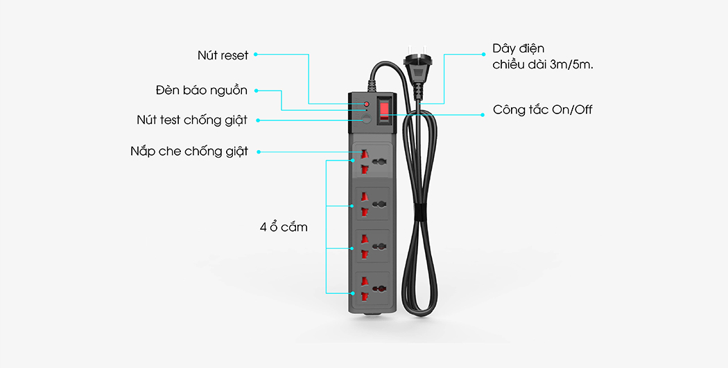 - Bảo vệ chống điện giật bằng tấm che mặt ổ cắm khi không sử dụng và tránh dị vật cắm 1 bên.
