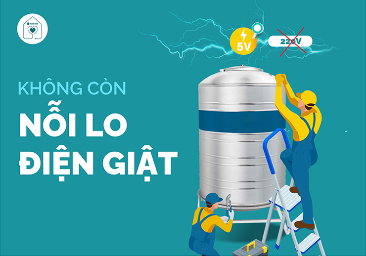 Ổ cắm sử dụng nguồn cách ly điện áp thấp 5V đến phao điện tại bể, giảm các nguy cơ gặp rủi ro về điện.